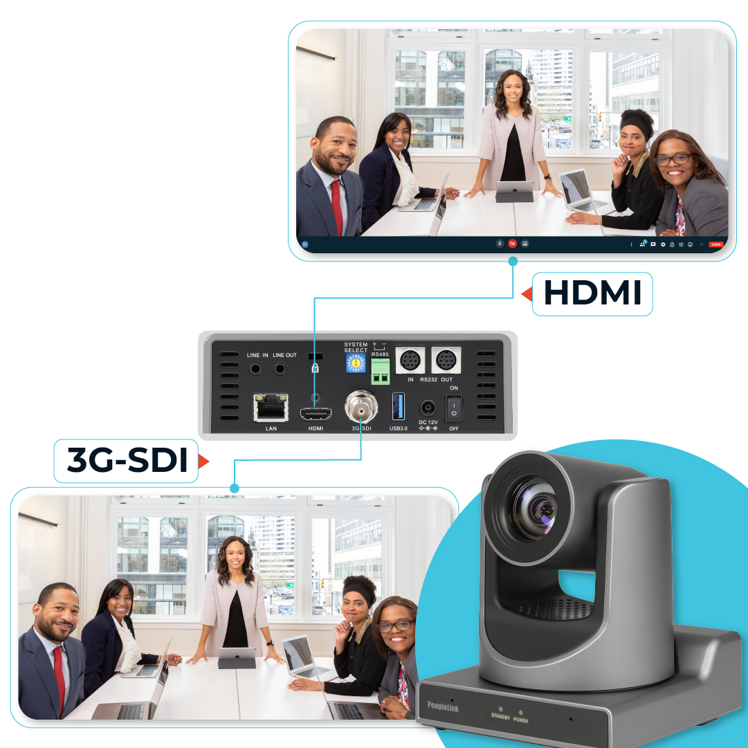 Expand your video conferencing experience with PeopleLink Elite XL Camera - the ultimate solution for crystal clear communication. With a wide field of view and the ability to rotate horizontally and vertically, this camera delivers an immersive experience for all participants. It outputs images through IP, HDMI, 3G SDI, and USB 3.0 type A interfaces, making it versatile and adaptable to any setup.